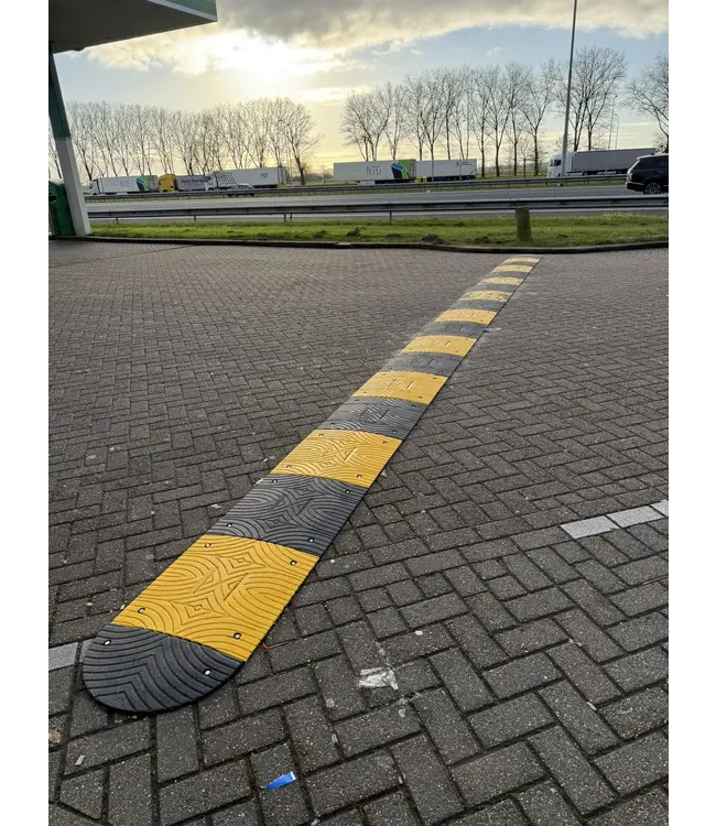 Ferðsluhindring – 3 cm hædd Henda 3 cm ferðsluhindring er væl egnað til øki, har tørvur er á lágari ferð, vanliga til umleið 30–40 km/t. Við lægri profili hevur hon ein mildari ávirkan á akfør samanborið við hægri hindringar, og er tískil væl egnað til at minka ferðina uttan at skapa eitt brádliga stoyt. Nákra ferðina, hon avmarkar til, er eisini treytað av breiddini og sniðinum á hindringini (so sum ferðslupallur ella vanlig humpa). Hindringin verður ofta brúkt innandura til gaffiltrukkir og annað intern flutningsamboð, og hevur tí fingið heitið “gaffiltrukkhumpa”. Hon gevur eina álítandi loysn til ferðslustýring í innandura…